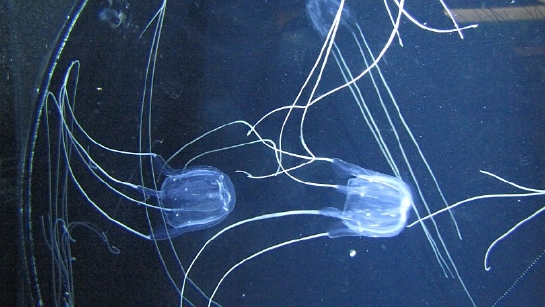 触手があるほうがカギノテクラゲ。